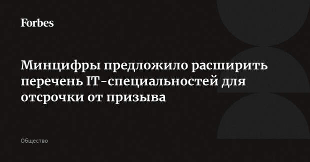 Минцифры предложило расширить перечень IT-специальностей для получения отсрочки от призыва на срочную службу. В частности, в него могут включить магистратуру по направлениям «Радиофизика» и «Статистика», а также бакалавриат по направлению «Ядерная физика и технологии». Кроме того, предлагается предоставлять закончившим обучение IT-специалистам из аккредитованных IT-компаний отсрочку даже в том случае, если они еще не получили диплом на момент формирования списков