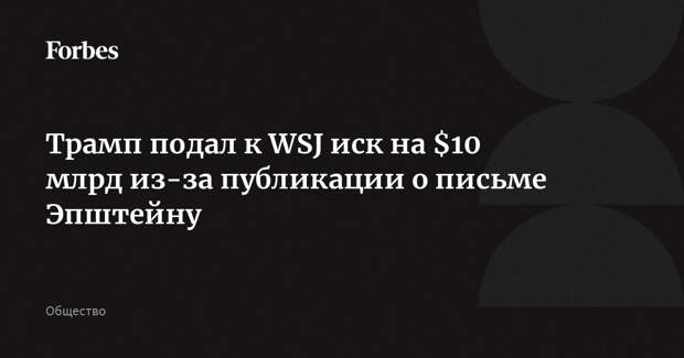 Трамп подал к The Wall Street Journal и ее владельцам иск о клевете на $10 млрд. Поводом для него стала публикация WSJ, в которой говорилось, что в 2003 году Трамп отправил Эпштейну на день рождения письмо с рисунком обнаженной женщины и пожеланием, чтобы «каждый день был еще одним прекрасным секретом».