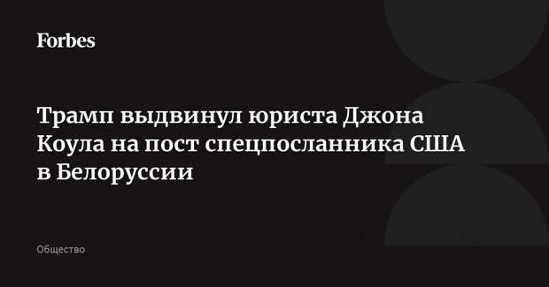 Трамп сообщил, что решил выдвинуть Джона Коула на должность спецпосланника США в Белоруссии. По словам американского лидера, Коул ранее успешно договорился об освобождении в Белоруссии сотни заключенных, а сейчас добивается освобождения еще 50 человек. Коул в сентябре посетил Минск, после чего Лукашенко помиловал 52 заключенных.