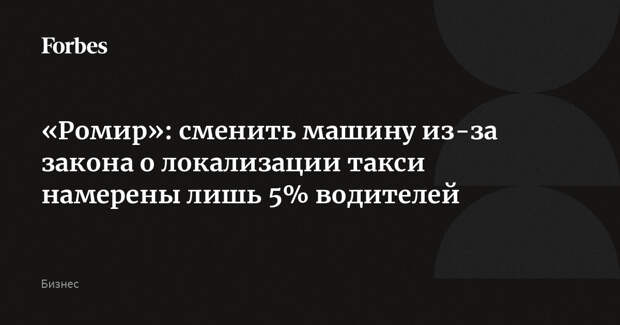 Только 5% водителей намерены поменять автомобиль из-за закона о локализации такси, сообщили Forbes в холдинге «Ромир». Согласно исследованию компании, доля таксистов, работающих на личных и не локализованных автомобилях составляет 45%, а 54% водителей такси считают свои машины отвечающими новым требованиям.