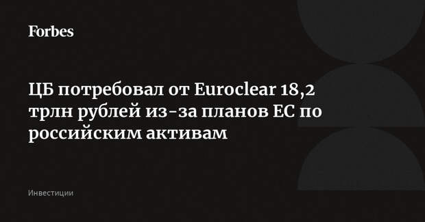 Банк России потребовал взыскать с Euroclear 18,2 трлн рублей, сообщила Forbes пресс-служба Арбитражного суда Москвы. Иск был подан 12 декабря, в тот же день, когда регулятор объявил о намерении подать на бельгийский депозитарий в российский суд из-за планов Еврокомиссии использовать замороженные российские активы для финансирования Украины